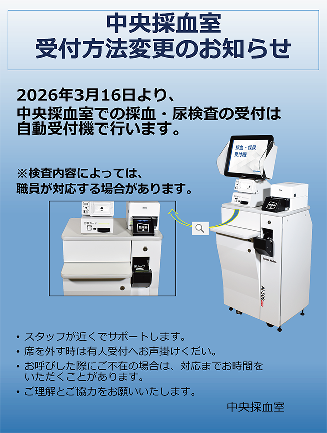 中央採血室の受付方法変更のお知らせ 2026年1月30日 2026年3月16日より採血・尿検査の受付は自動受付機で行います。 ※一部、職員対応となる場合があります。 受付の際はスケジュール票または診察券をご用意ください。 ご理解・ご協力をお願いいたします。 中央採血室 前の記事 次の記事